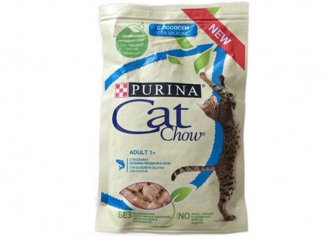 Влажное питание может быть на основе мяса лосося. Среди влажных кормов для взрослых животных предлагаются следующие добавки в желе: