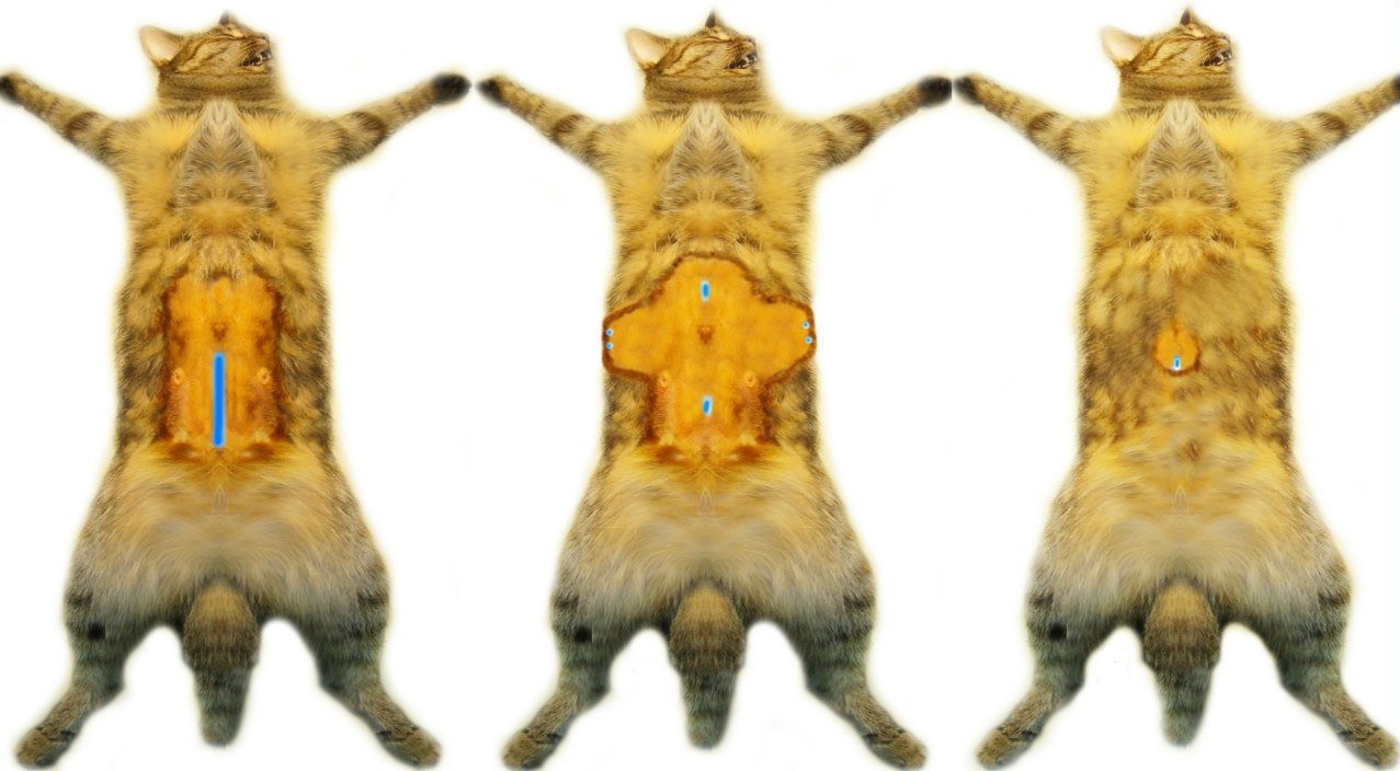 Классический разрез также называют срединным, по центру белой линии живота. После операции кошке надевается попона для защиты раны от проникновения грязи и предотвращения его разрыва. Реабилитационный период длится от недели до 10 дней, после врач снимает швы.