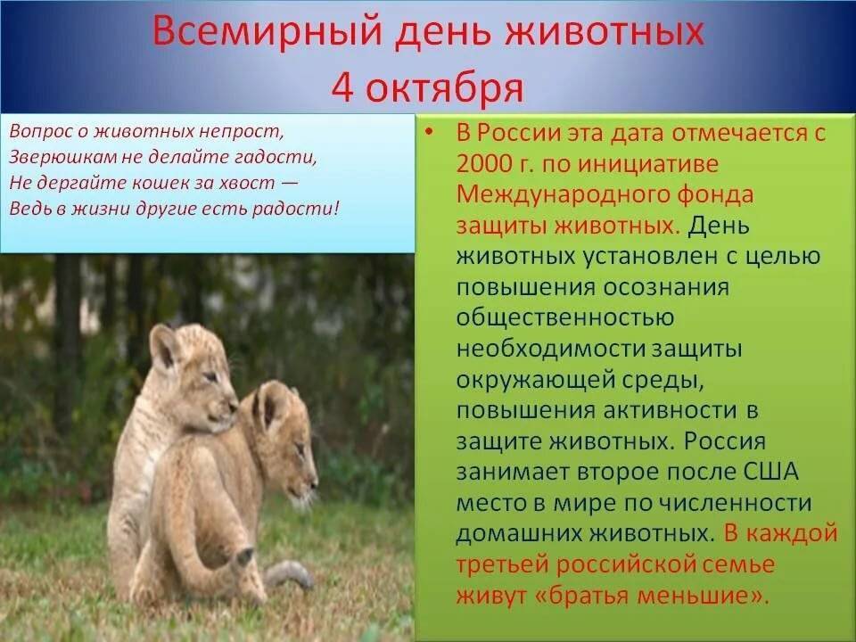 Человек как единственный разумный обитатель планеты несет ответственность перед другими живыми существами. Всемирный день защиты животных напоминает нам об этом. В 2022 году праздник отмечают в России и других странах.В мире высоких технологий нет более беспомощных существ, чем животные: дикие или домашние — их жизнь во многом зависит от человека, его деятельности и бесцеремонного вторжения в природу. День защиты животных призван напомнить об ответственности, которую мы несем за других обитателей планеты.Во множестве стран мира активно поднимают важные вопросы, такие как сохранение вымирающих видов, пресечение жестокости по отношению к питомцам, гуманное решение проблемы бездомных зверей, улучшение условий в зоопарках, питомниках и приютах.Всемирный день защиты животных охватывает всех живых существ и уникальные проблемы каждого вида. Этот праздник многонациональный — любовь и уважение к братьям нашим меньшим не зависят от возраста, пола, цвета кожи, этнографических признаков и религиозной принадлежности.