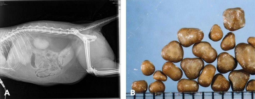 Тип солей, оседающих в мочевом пузыре у животного влияют на образование камней той или иной группы. Чаще всего это струвиты и оксалаты. К примеру, струвиты являются фосфатами и формируются преимущественно у котов до шести лет. Они отличаются твердостью и рыхлостью. Появляются камни из-за неправильного или несбалансированного рациона, приводящего к ощелачиванию мочи.
