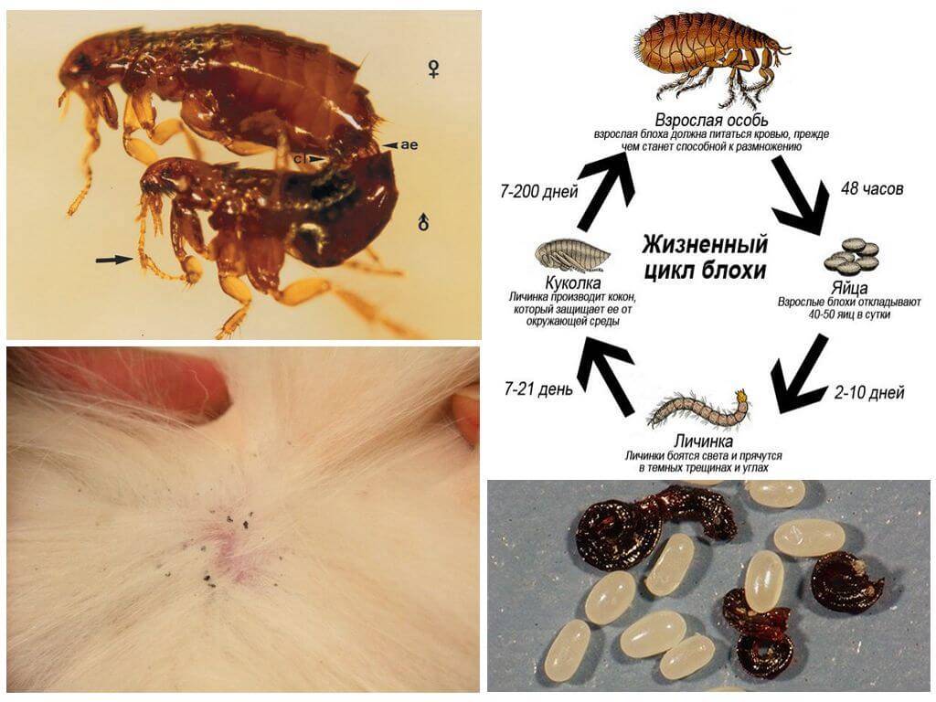 Блохи относятся к насекомым с полным превращением. Оплодотворенная самка не откладывает яйца в одном месте, а с силой выбрасывает их в окружающее пространство. Они попадают на находящихся рядом животных, тем самым заражая их.