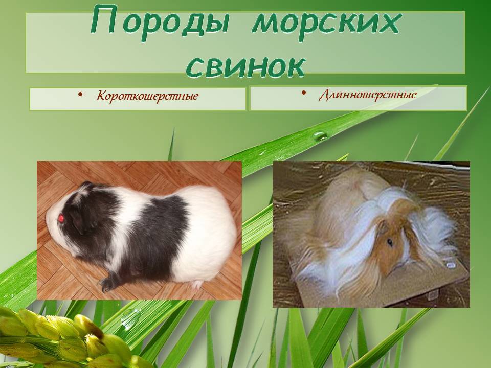 В зависимости от породы морской свинки, а также от длины её шерсти, могут зависеть рекомендации относительно ухода за таким грызуном. Так, к примеру, за представителями бесшерстных пород морских свинок необходимо ухаживать более тщательно, так как они в силу того, что лишены шерстяного покрова, они более уязвимы, и резкие перепады температурного режима, долгое пребывание на солнце – всё это может привести к заболеванию вашего питомца (подробнее о болезнях морских свинок) и даже к его гибели.