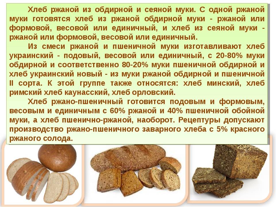 Ржаной хлеб обычно готовят из смеси ржаных зерен и ржаной муки. Существуют разные сорта ржаного хлеба, такие как темный, светлый, мраморный и пумперникель.
