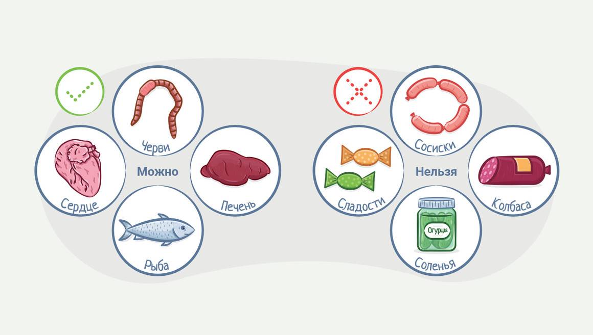 В качестве белкового компонента можно давать как червей, насекомых, улиток, так и небольшие кусочки отварного или сырого мяса.