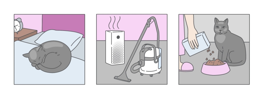 Во время острой фазы аллергии нужно ежедневно проводить влажную уборку помещения. Если питомец расчесал кожу, необходимо несколько раз в день обрабатывать рану антисептическими и противозудными средствами, пока на ее месте не образуется корочка. Больному животному нужно отдыхать: не нужно занимать его играми и брать на руки, если он сам не попросится. Для оценки эффективности лечения нужно регулярно осматривать животное.