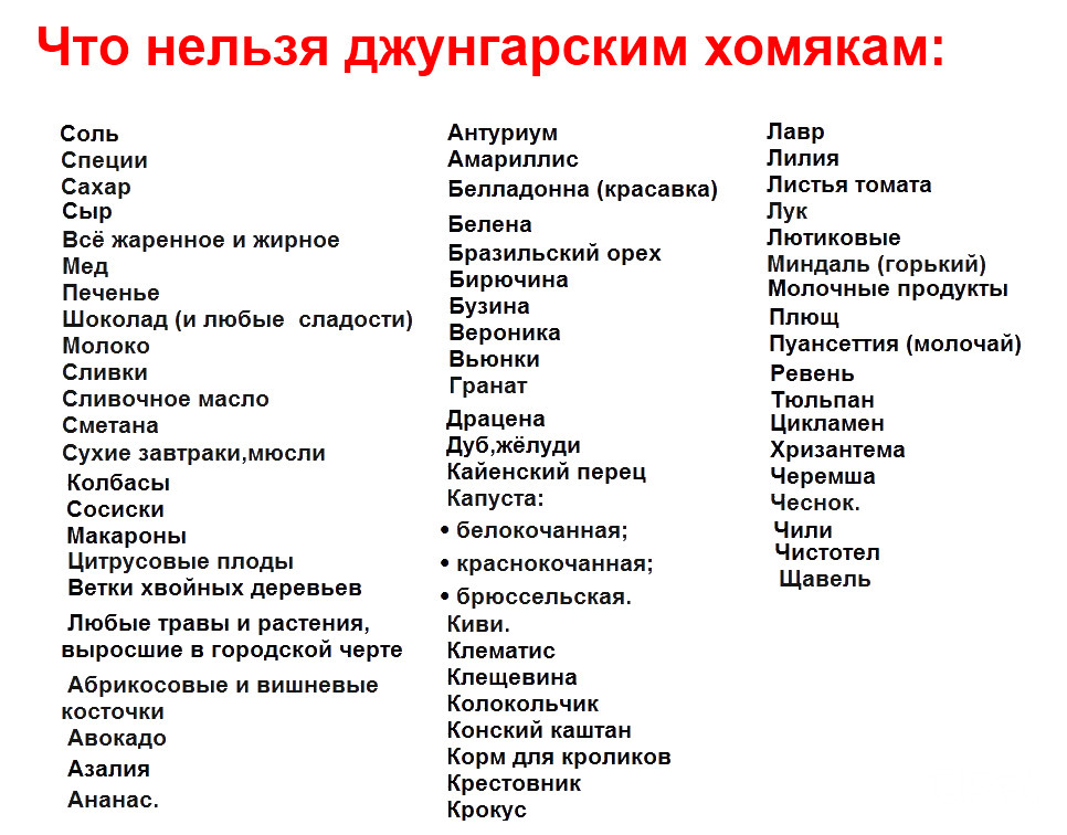 1. Соль, сахар, специи 2. Масло сливочное 3. Цитрусовые 4. Сухие завтраки, мюсли 5. Миндаль 6. Чеснок 7. Лук, лук-порей 8. Вишневые, абрикосовые косточки 9. Глазки сырого картофеля, картофельная кожура 10. Колбаса, сосиски 11. Коровье, козье молоко в чистом виде, а также в виде основы для каш 12. Сметана, сливки 13. Экзотические фрукты (и киви, гранат, авокадо, ананасы тоже) 14. Все жареное и жирное 15. Сухие макаронные изделия 16. Арбуз 17. Щавель 18. Тюльпан 19. Козинаки 20. Грибы 21. Мед (в чистом виде) 22. Ветки хвойных деревье (сосны, лиственницы, ели, лжетсуги) , так как они выделяют смолу вредную для хомяков. 23. Любые травы и растения, выросшие в городской черте 24. Фруктовые соки 25. Хлеб черный 26. Мята 27. Мотыль, насекомые, выловленные в природе 28. Капуста белокочанная, краснокочанная, брюссельская 29. Печенье, шоколад, мороженое