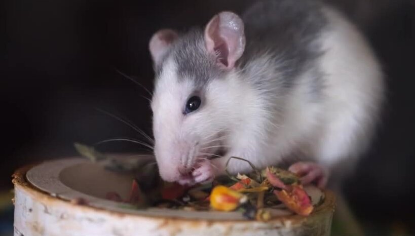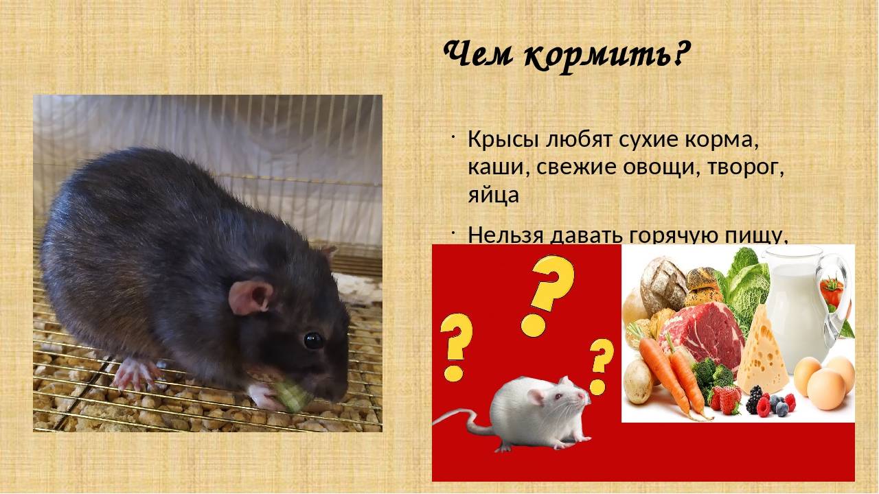 Крысам рекомендуется питаться сбалансированным рационом, включающим в себя свежие овощи и фрукты, зерно, семена, мясо и орехи.