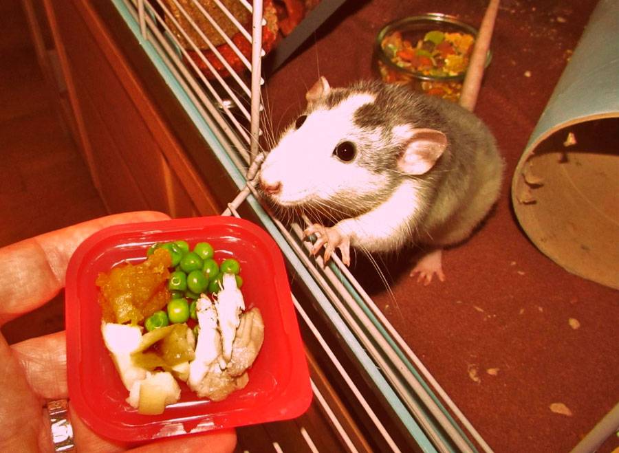 Крысам нужно питаться всего 1-2 раза в сутки. При этом в «меню» обязательно должны присутствовать зерно, овощи, фрукты, молочные продукты, пища, богатая белком, и лакомства.