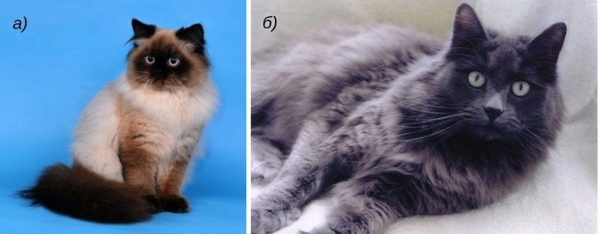 а) Вариация окраса колор пойнт; б) Сплошной голубой окрас с отчетливым серебристым отливом (кончики волос имеют серебристый типпинг)