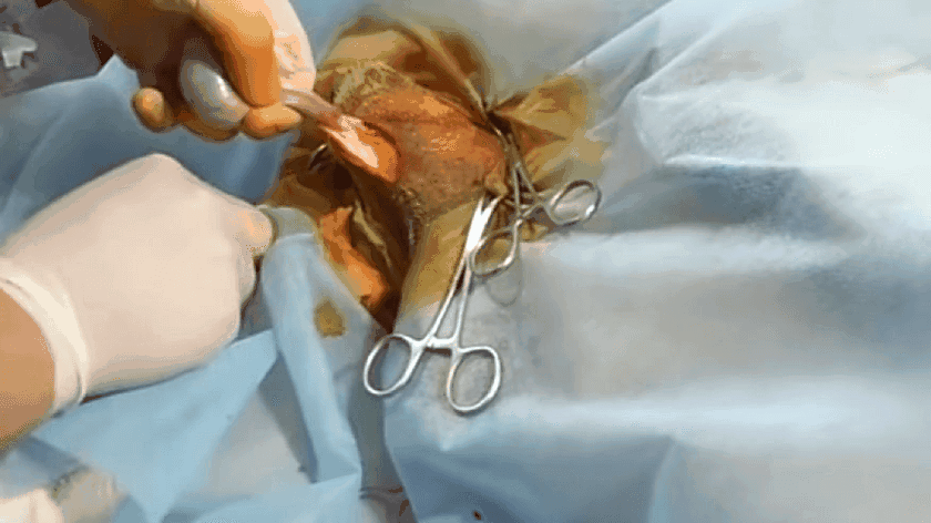 - Открытый метод хирургического вмешательства – включает в себя захват стенок мошонки над семенником, рассечение кожного покрова по среднему шву, вскрытие плотной влагалищной оболочки и извлечение семенника путем надавливания на мешок. Брыжейку семенника разделяют, а сосуды и семявыводящий проток перетягивают лигатурой.
