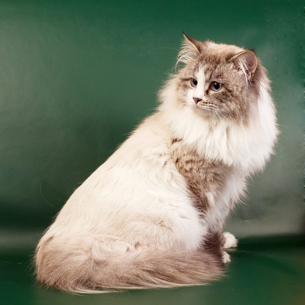Пушистая сибирская с богатым воротником, с роскошным хвостом кошка как бы на маскараде надела темную «маску» и «перчатки» сиамской кошки. «Маска» на мордочке может быть не только темно-коричневой, но и других интересных расцветок.