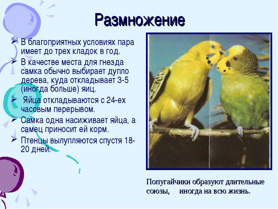 Для воспроизведения потомства, надо знать не только как содержать волнистого попугая, но и как обеспечить условия для размножения. В первую очередь надо не искать или строить гнездо, а найти подходящую пару. Если в течение продолжительно варианта они не начнут общаться, а один из них и вовсе будет сидеть нахохлившись, то вряд ли что-то получится, и придется подсаживать другого попугая. Однако, если они сдружатся, то не стоит в дальнейшем их разлучать – они очень привязываются друг к другу и без пары будут тосковать.