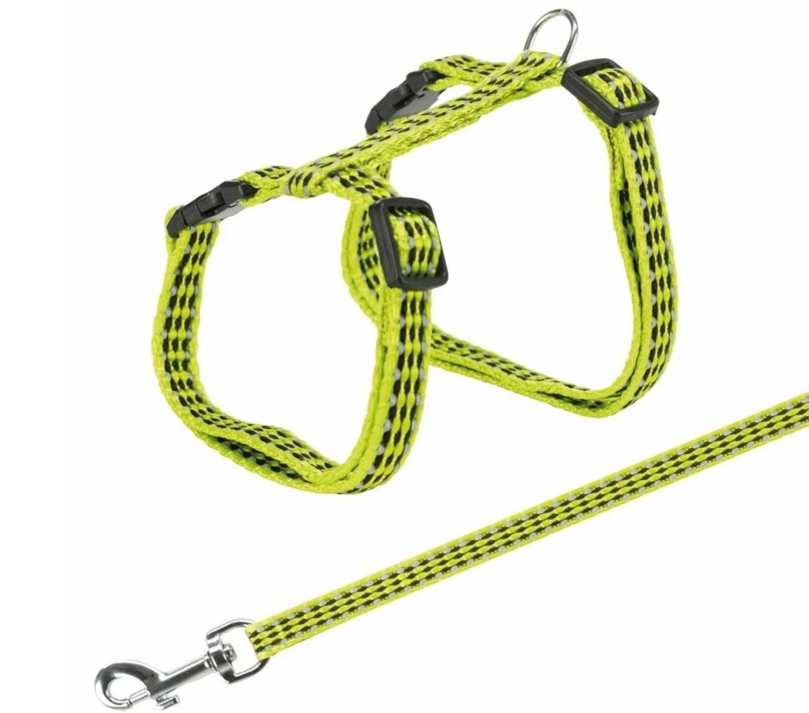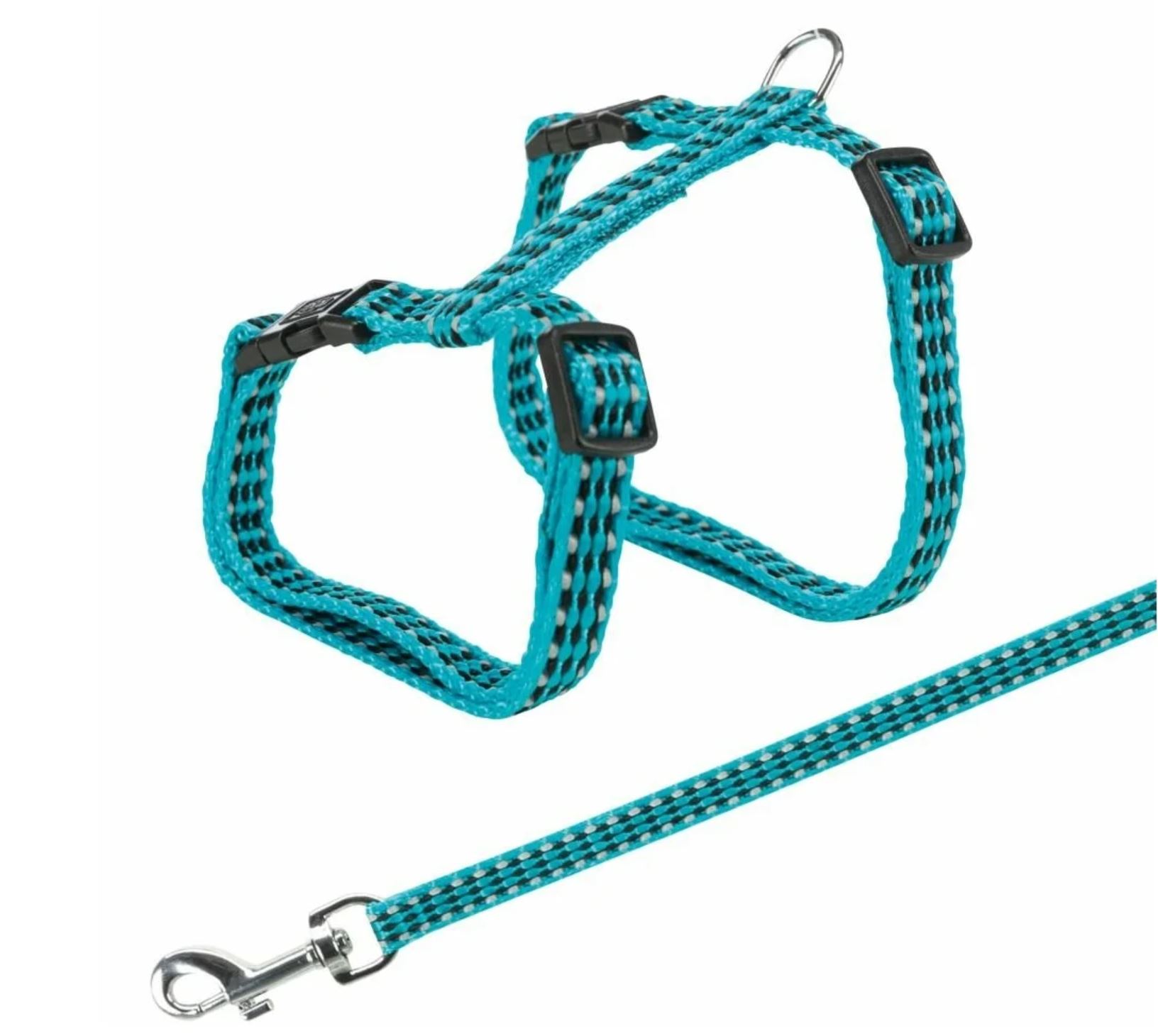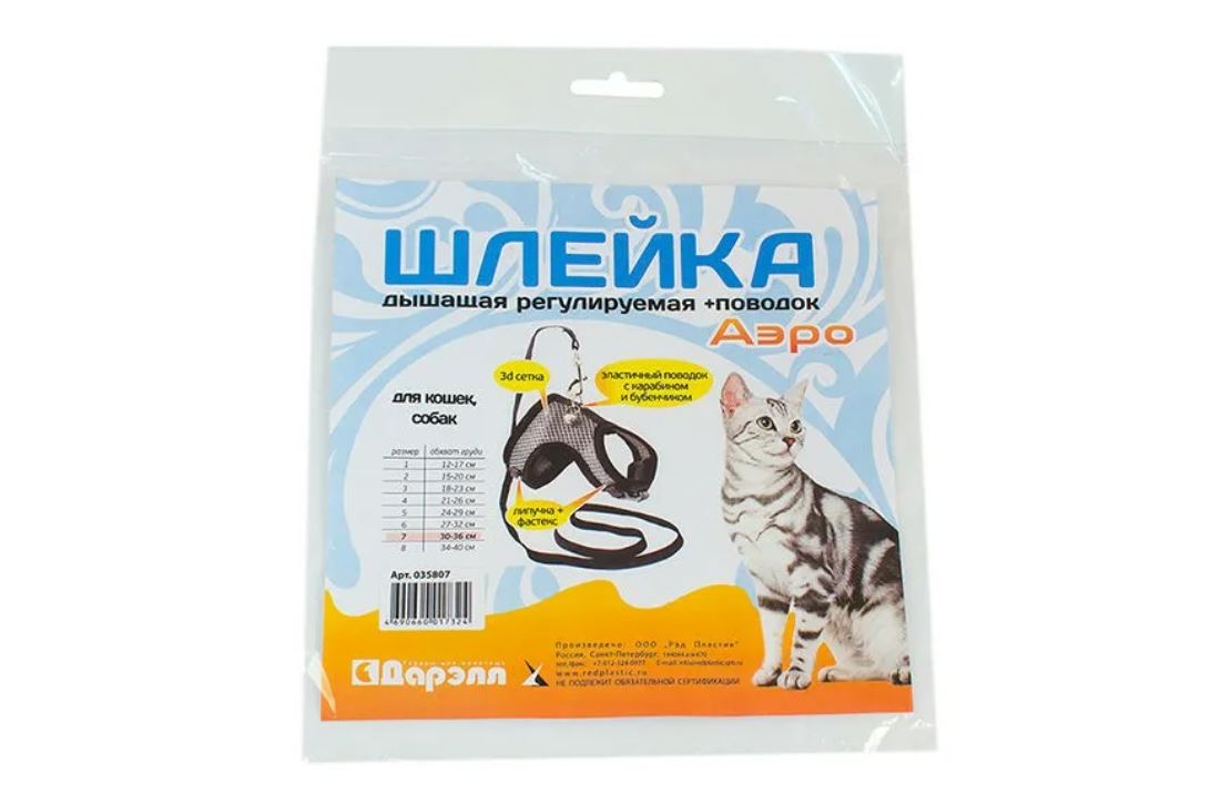 Шлейка-жилетка из сетчатой ткани отличается яркими цветами. Мягкая ткань при ношении не причиняет дискомфорта кошке, легко отстирывается, быстро сохнет. Изделие сшито так, чтобы хозяева могли регулировать обхват шеи, груди. Запас прочности на разрыв шлейки равен 50 кг, на разрыв поводка — 25 кг.