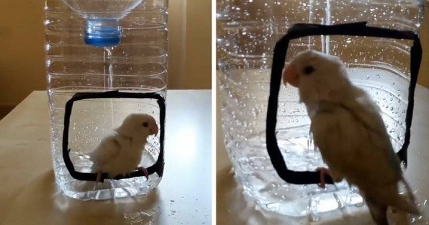 Имея постоянный доступ к емкости с водой, попугай больше не испытывает страх перед купанием.