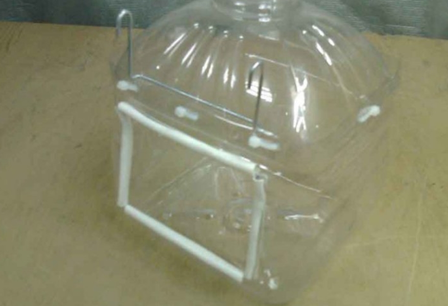 Можно взять неглубокую и широкую стеклянную баночку под крышку с резьбой. По резьбе обмотайте проволоку и надежно прикрепите баночку к прутьям клетки. Временная поилка готова.