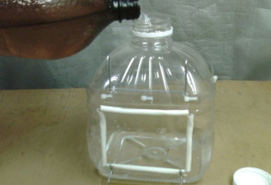 Заполняем маленькую емкость водой, переворачиваем ее, утыкаем горлышком в наше самодельное «блюдце». Теперь нужно проволокой прикрепить конструкцию к прутьям клетки. Крепление необходимо сделать надежным.