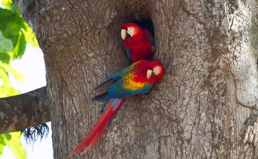 - Судя по яркому окрасу, невозможно представить, как такой заметный попугай маскируется. На деле притихших птиц никак не разглядеть в кроне деревьев, и только по падающим огрызкам фруктов становится понятно, кто спрятался в листве.