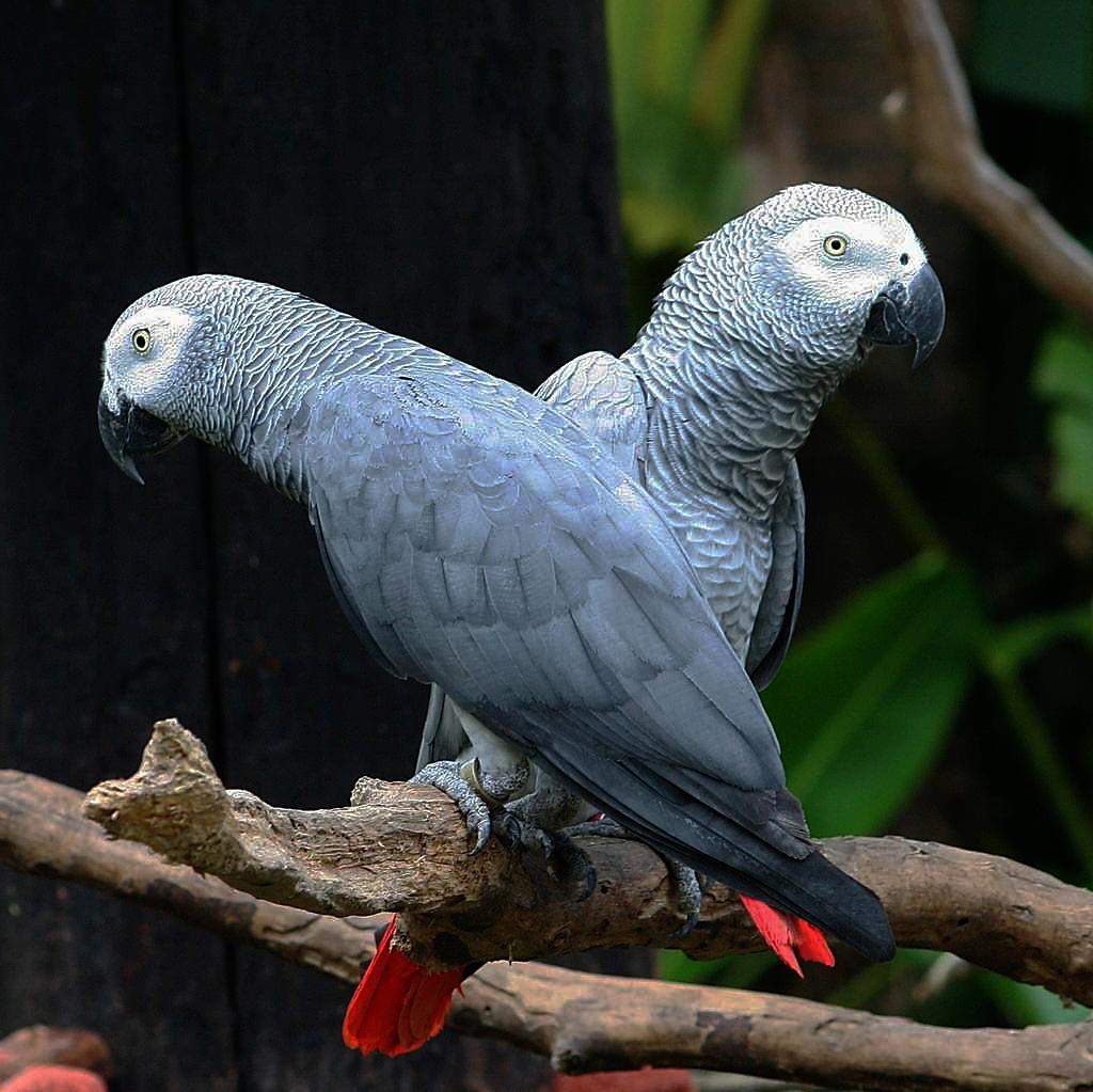 Краснохвостый жако (Psittacus erithacus erithacus) Длина тела до 35 см. Общий окрас оперения светло-серый, перья хвоста ярко-красные, клюв чёрный. Радужка светло-серая. Обитает в Танзании и Анголе.