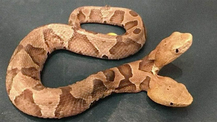 Медноголовый щитомордник – редкая находка 2-х головой змеи в штате Вирджиния. Ученые выяснили, что одна голова этой необычной змеи – доминантная. Яд есть в обеих головах.