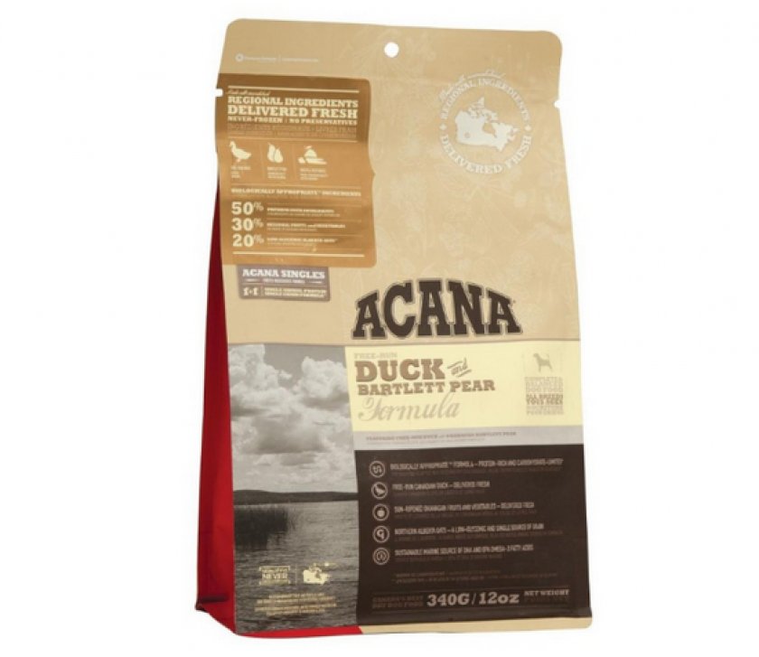 - AcanaDuck&BartlettPear –питание для собак, состав которого включает 50% источник белка – утки;