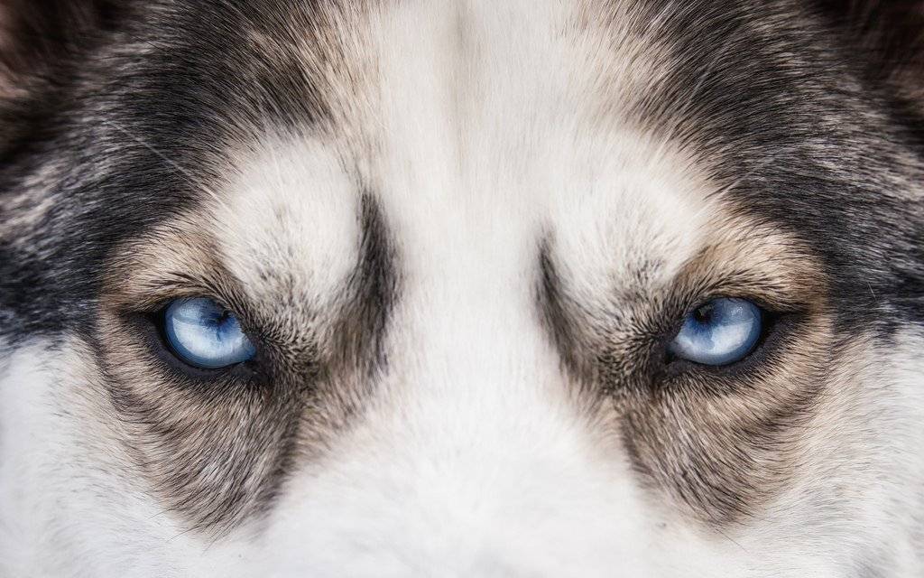 Глаза имеют овальную или круглую форму, отсутствуют выпуклости. Веки чёрного цвета. Довольно часто, от внешнего угла проходит «стрелка», характерная для представителей породы хаски. Радужка может быть всех оттенков синего. Допустимым вариантом считается нечётность глаз, когда один синий, а другой – карий. Глаза являются слабым местом животного, поэтому раз в несколько месяцев питомца следует отвозить к ветеринару для проверки состояния зрения и чистки глаз.