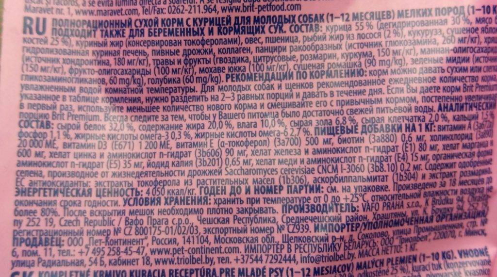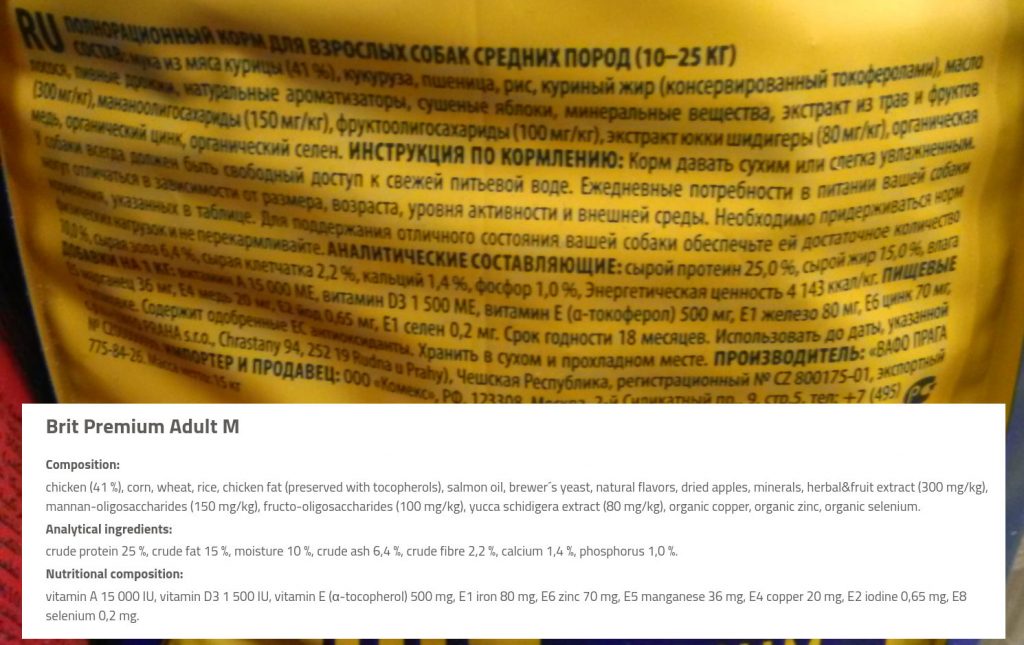 Рассмотрим состав корма «Брит Премиум» на примере варианта Adult M (для взрослых собак средних пород). Посмотреть его можно на фотографии ниже (для удобности чтения кликните по изображению чтобы увеличить его):