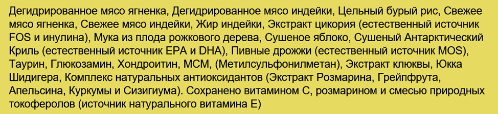 - низкозерновой с добавлением пробиотиков. Состоит из кролика и ягненка, индейки или утки, коричневого риса, масла лосося, криля, клюквы, сушеных яблок, батата и цикория;