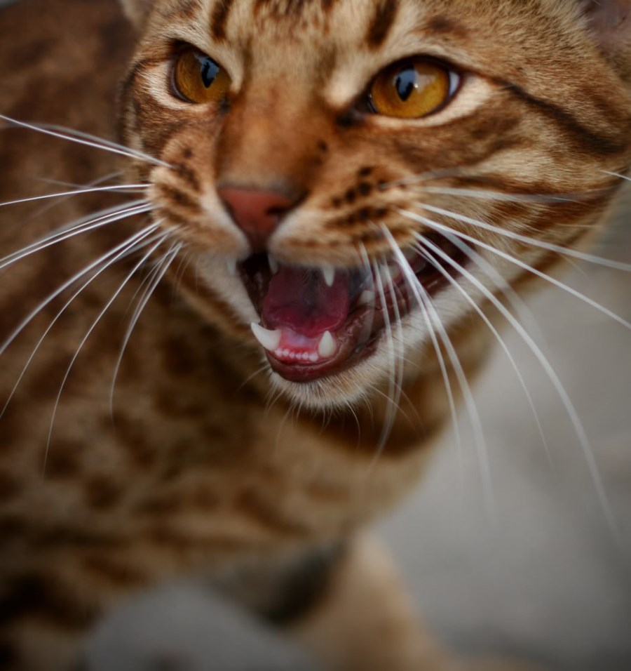 - Широкая мордочка в форме клина с практически не выраженным стопом и линией изгиба между щеками и подбородком. При взгляде на кошку в профиль ее голова кажется немного вытянутой. В положении спереди морда имеет форму квадрата. Подбородок и челюсти развитые, шея длинная и гибкая.