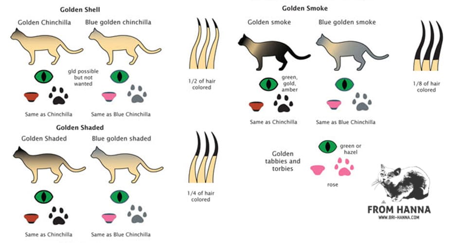 При этом у многих Золотых Шиншилл есть абрикосовый подшерсток, но истинная золотистость возникает только при высокой степени насыщенности желтым феомеланиновым окрашиванием всего волоска. Это и делает разведение кошек этого окраса очень сложным, так как наследуется «золотой ген» типовым неполным доминированием. В этом случае слабые рецессивные признаки не могут быть полностью подавлены.