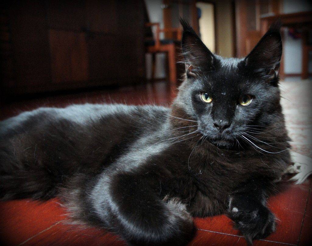Мейн кун солид черного цвета ничуть не уступает белым кошкам. Многие любители данной породы выжидают долгие годы, чтобы приобрести такое крупное счастье.