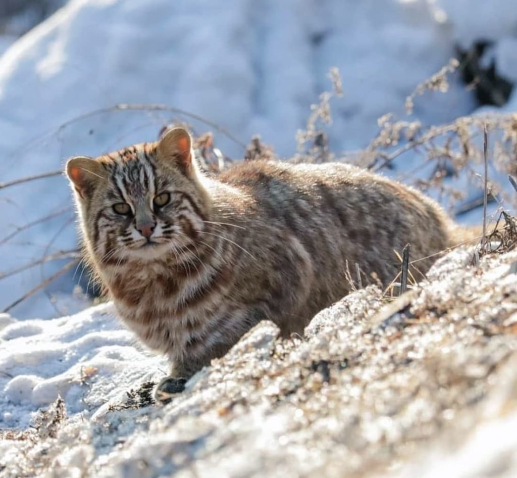 Зима — самое тяжелое время в жизни этих диких кошек. У него тонкие и короткие ножки — это даже видно на фото.