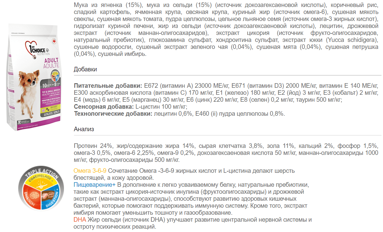 Под брендом 1st Choice PLB International выпускает только сухие смеси. Компания обладает множеством европейских, канадских, американских сертификатов качества, поэтому нет повода сомневаться, что на упаковке указан полный список ингредиентов.