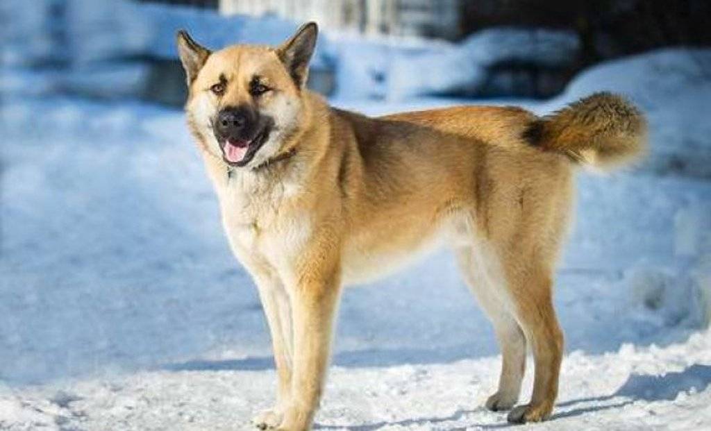 Помесь с хаски наследует от алабая крупное телосложение. Цвет шерсти, голубые глаза, стоящие треугольные уши – это проявление гена хаски. Шерстка у такого питомца плотная.