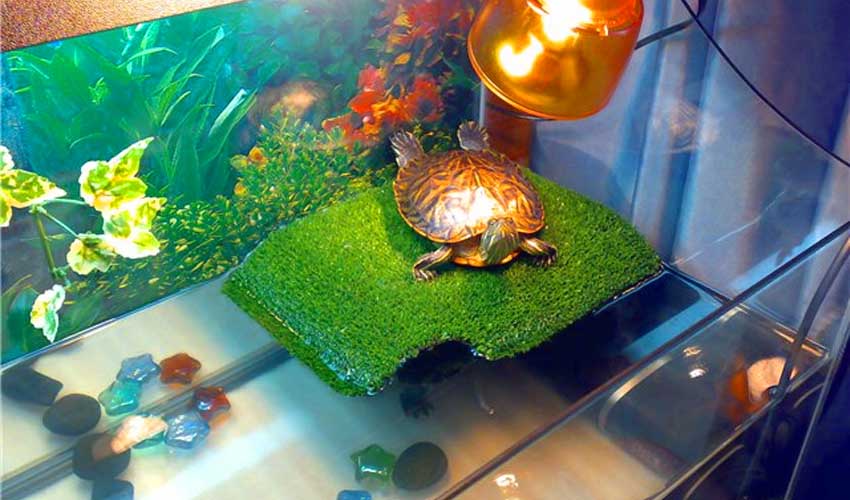 Красноухая черепаха считается плавающей рептилией. Кроме воды, она может находиться еще и на суше, выползая, чтобы погреться. Этот участок должен занимать 25% от общей площади террариума. Прикреплять островок следует к основанию резервуара.