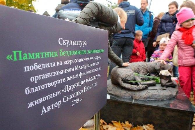 4 октября – во Всемирный день защиты животных – в парке искусств «Музеон» был открыт памятник бездомным животным. Он стал призывом к милосердию, отлитым в бронзе: скульптурная композиция изображает дворняжку с пронзительным взглядом, которая лежит и греется на канализационном люке, а рядом с ней лежит старый изорванный башмак. Согласно первоначальному проекту, памятник должен был быть одновременно и копилкой, чтобы собирать пожертвования от неравнодушных к судьбе бездомных животных людей и отправлять их на нужды приютов для животных. Но по закону установка таких конструкций в парках и местах общественного отдыха запрещена, поэтому ни миски, ни шапки, куда можно было бы бросать монетки, у скульптуры нет. Но инициатор проекта – фонд «Дарящие надежду» – все же надеется, что памятник дворняжке сделает свое дело, и проходящие мимо люди вспомнят о том, как много вокруг четвероногих, которым нужна помощь, дом и человеческое тепло.