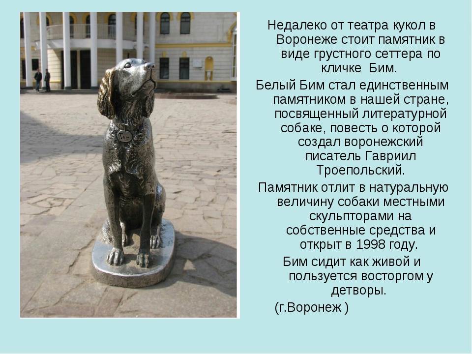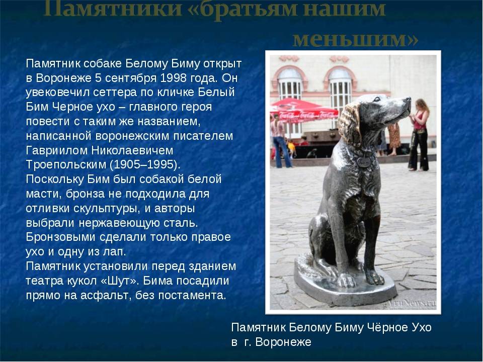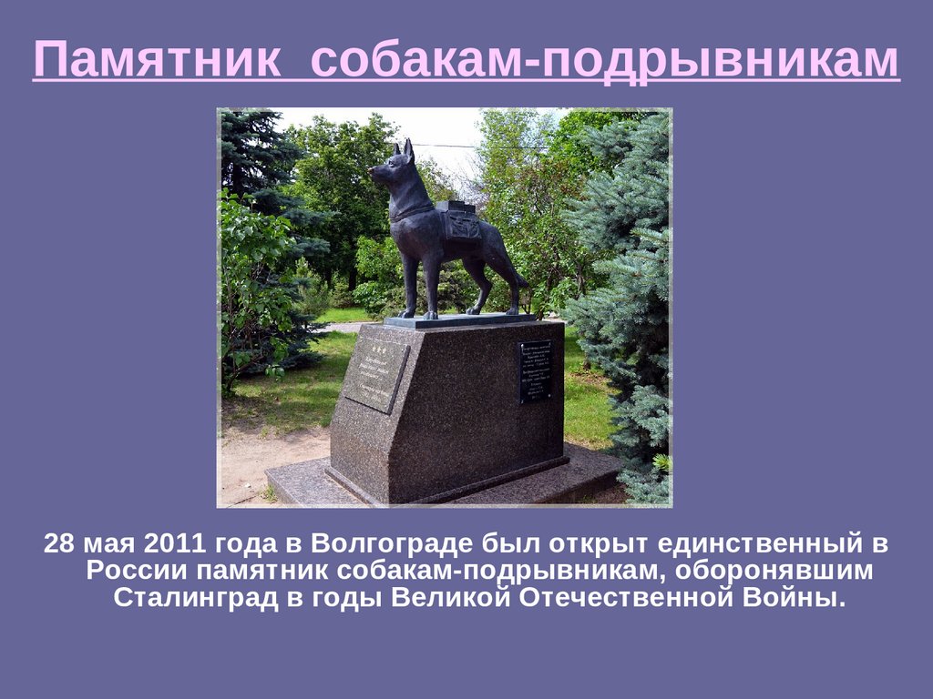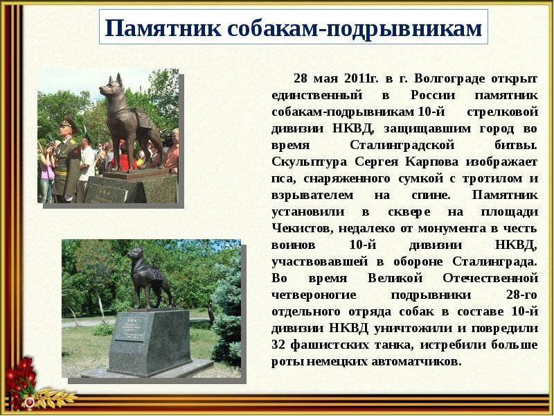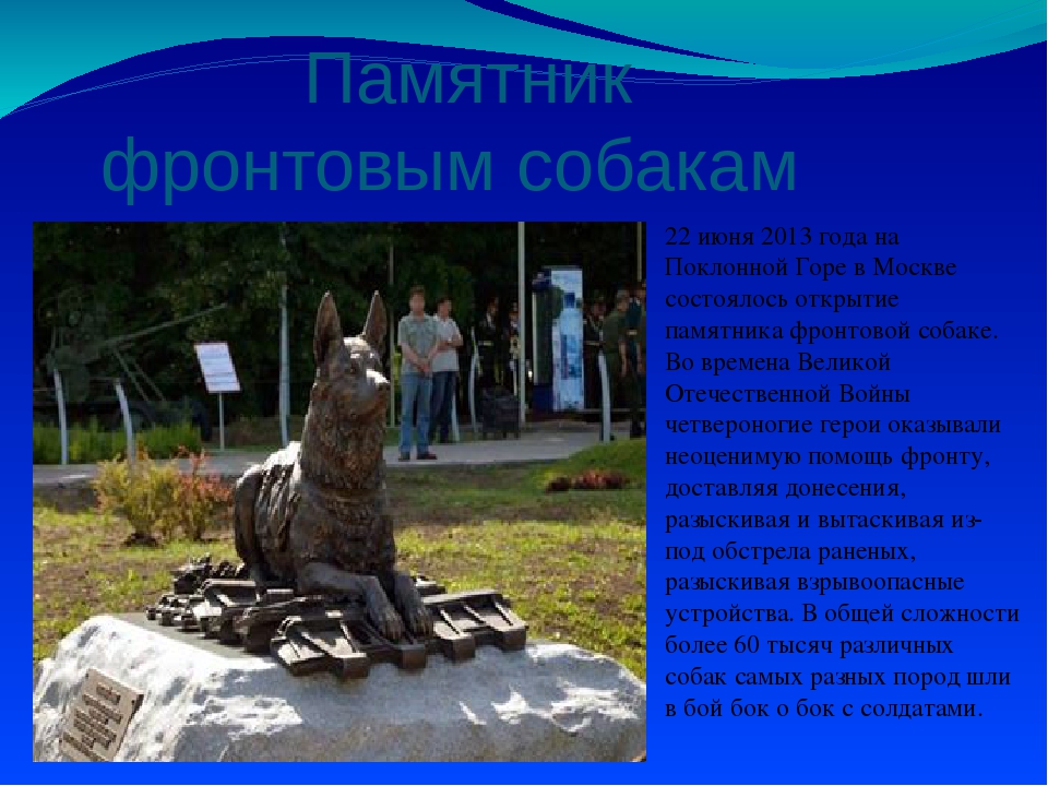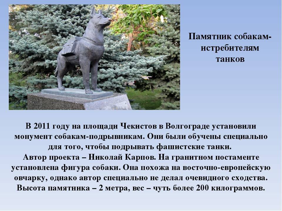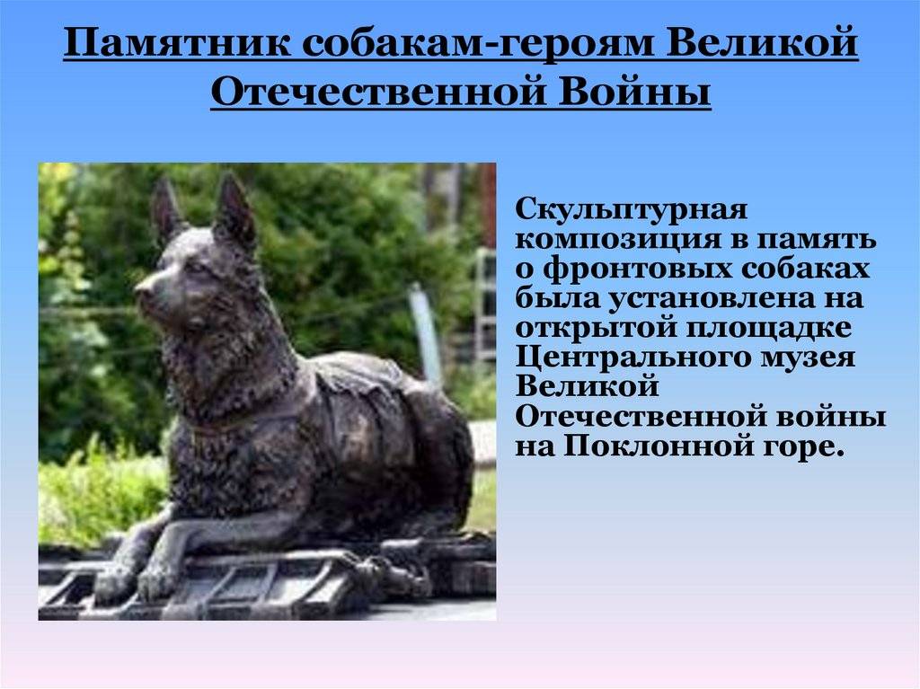 Памятники этим и многим другим четвероногим друзьям, установленные в разных городах России, напоминают людям об их подвигах и безграничной верности и преданности.