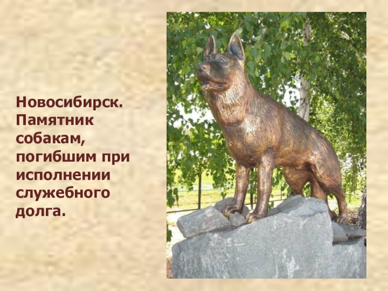 Новосибирский кинологический центр, который проводит подготовку надёжных и верных помощников человека, тоже известен памятником. Овчарка из бронзы – это образ, который отображает память о всех собаках, погибших при исполнении служебного долга и защищавших своего хозяина.