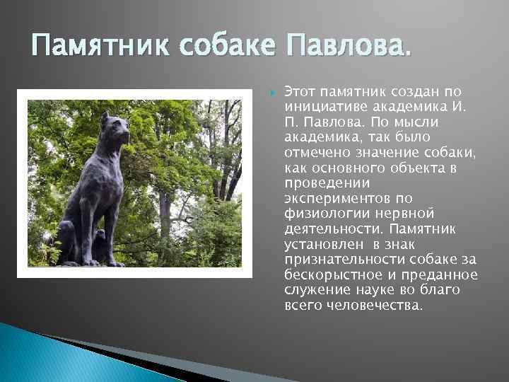 Монумент был создан по инициативе самого академика Павлова. Он хотел отметить значение собаки в его работе по изучению физиологии нервной деятельности.