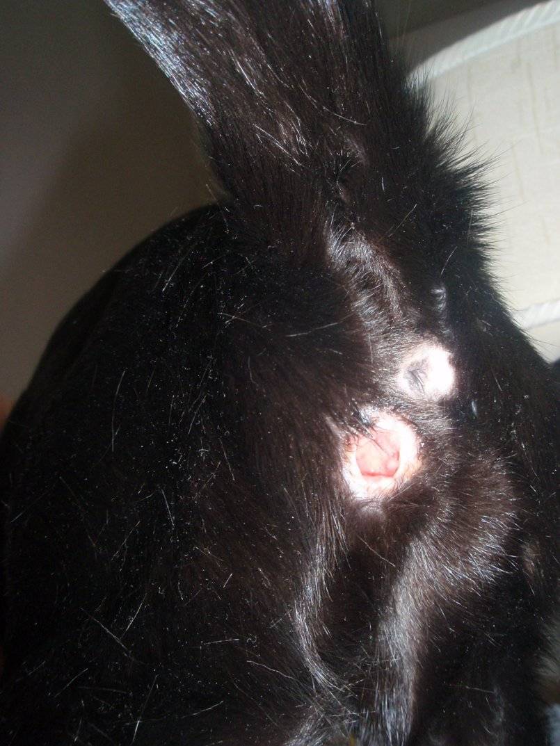 - взъерошенность шерсти или отсутствие шерстного покрова в связи со значительным вылизыванием. Иногда взъерошенность может переходить на хвост. Основание становится липким, грязным. В этом случае болезнь называют «конский хвост» ;