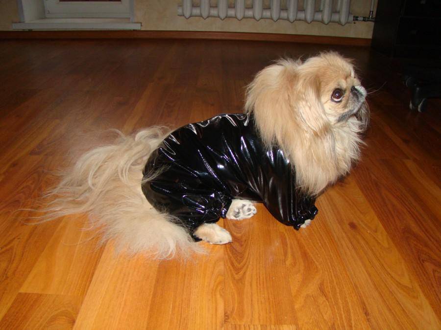 Собаку выгуливают в комбинезоне (см. на фотографии). Без одежды пекинеса выпускают только на лужайку с коротко подрезанной густой травой.