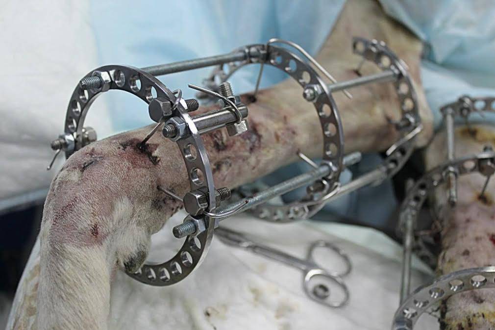 При переломах голени, сложных либо открытых переломах собак обычно используют аппараты внешней фиксации, похожие на аппараты Елизарова, которые после полного заживления костей необходимо извлечь.