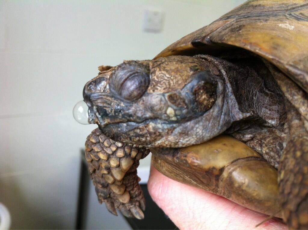 Эти же слизистые выделения могут попадать в ротовую полость, поэтому часто у черепах наблюдается выделение пузырей и слизи из носа и рта.