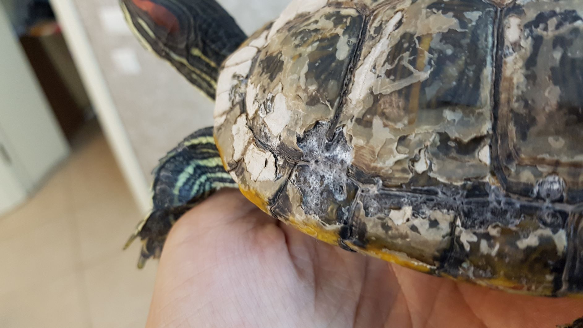 Симптом. Отслоение роговых пластин с панциря красноухой черепахи.