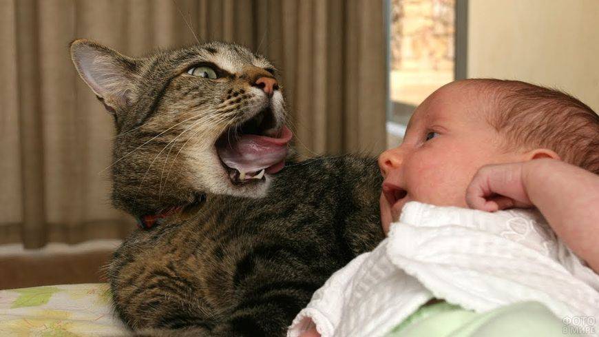 Территориальные притязания. Коты по-разному реагируют на появление новеньких на своей территории, будь то другой кот, собака или новый член семьи. Те из них, кто активно прогоняют чужаков, могут попытаться выгнать и новорожденного, по-разному показывая ему, кто тут настоящий хозяин. Шипение и нападение тоже могут идти в ход.
