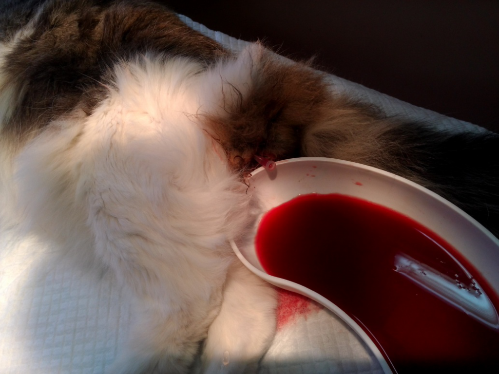 каждые 2 часа вливают кошке пипеткой в рот несколько капель масла;