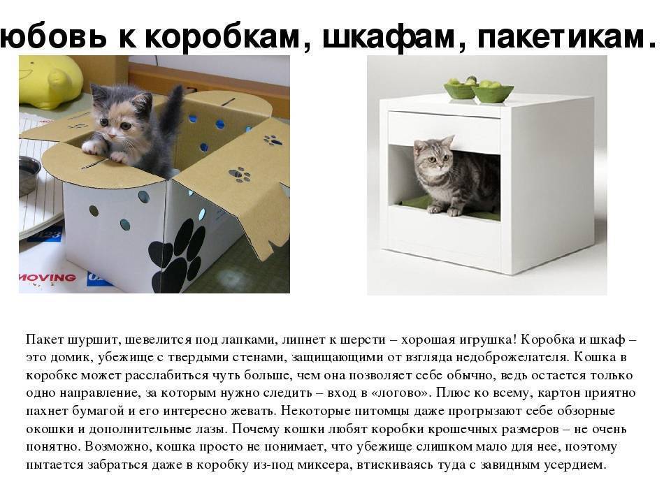 Почему именно так? Версий множество, но однозначного ответа нет. Но пусть это не помешает вам подарить своему любимцу очередную коробочку, в которой он будет чувствовать себя: