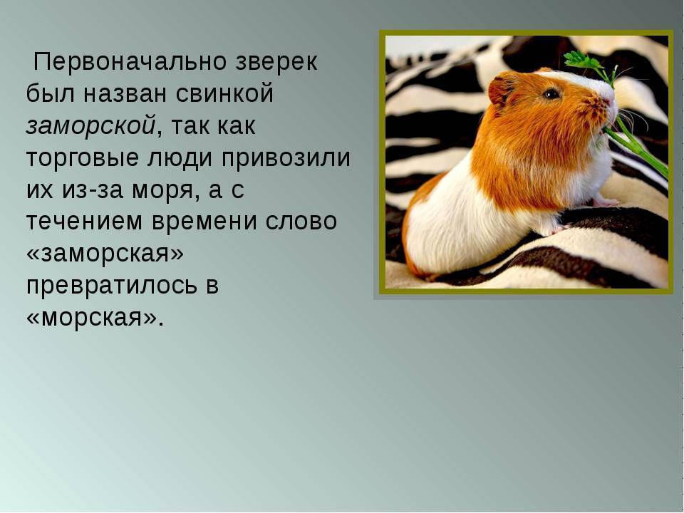 Многие отмечают, что со свинками эти животные имеют мало общего. Разве что строение тела без талии и звуки, напоминающие похрюкивание. Из-за чего и получили свое название. «Морская» означает «Заморская», поскольку завезено животное было из Америки, заморской страны.