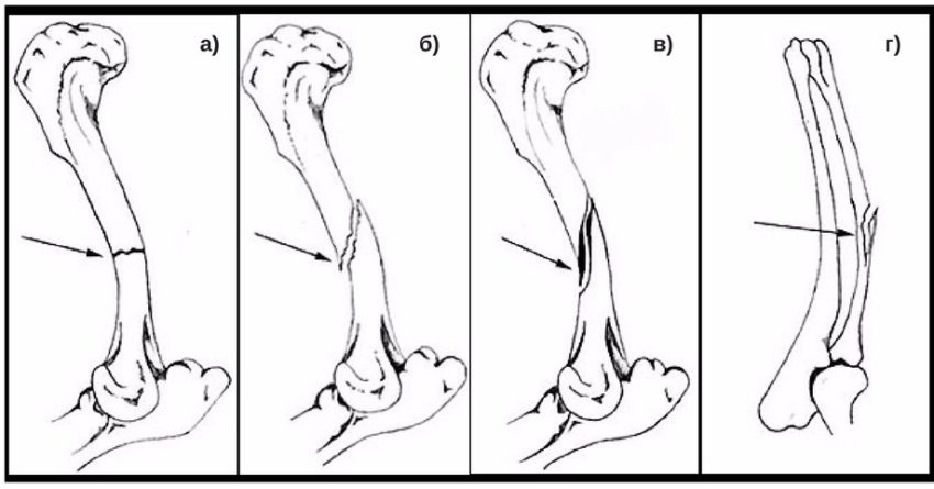 а) Поперечный диафизарный перелом; б) косой диафизарный перелом; в) спиральный; г) неполный перелом трубчатой кости.