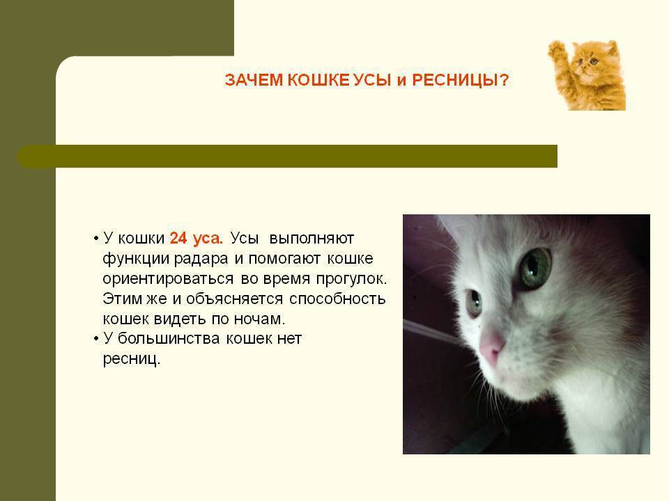 Получать информацию об окружающей обстановке. Это основная функция усов – вспомните, как в темноте мы расставляем руки в стороны, чтобы сориентироваться. Кошки используют усы, чтобы не натыкаться на предметы, прикасаясь к ним по дороге к нужному месту.