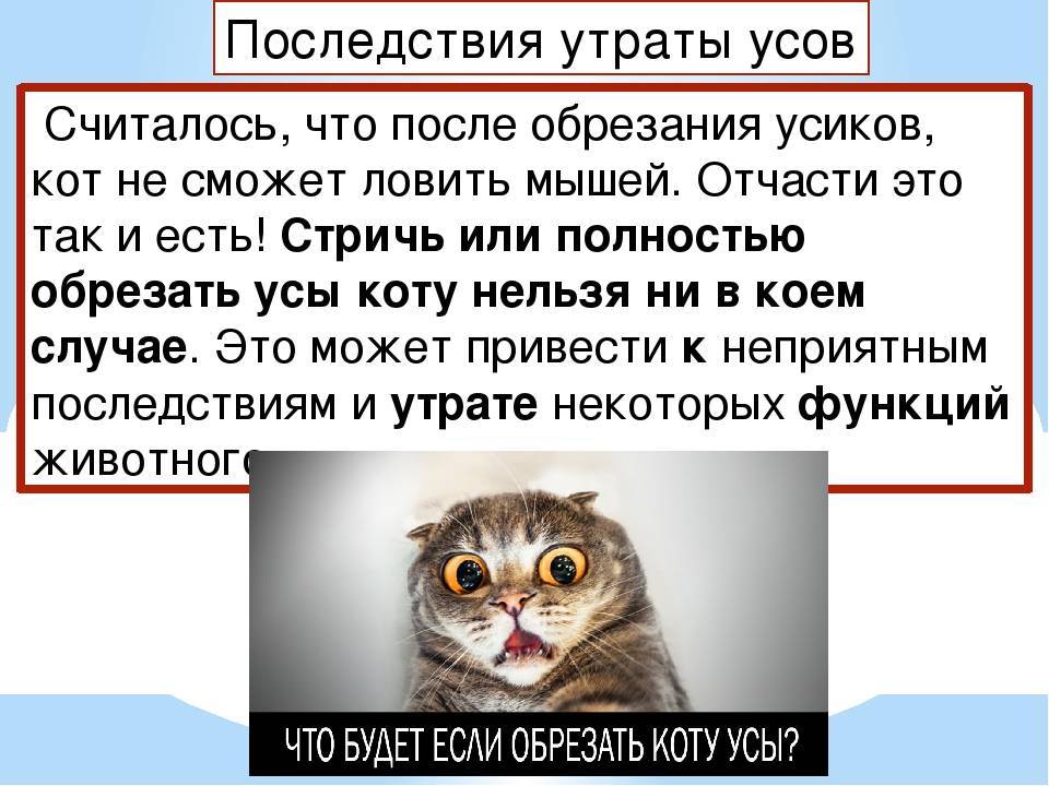 - Какими бы длинными не казались усы у кота, их нельзя подстригать и выщипывать. Подобные процедуры — большой стресс для всех кошачьих.